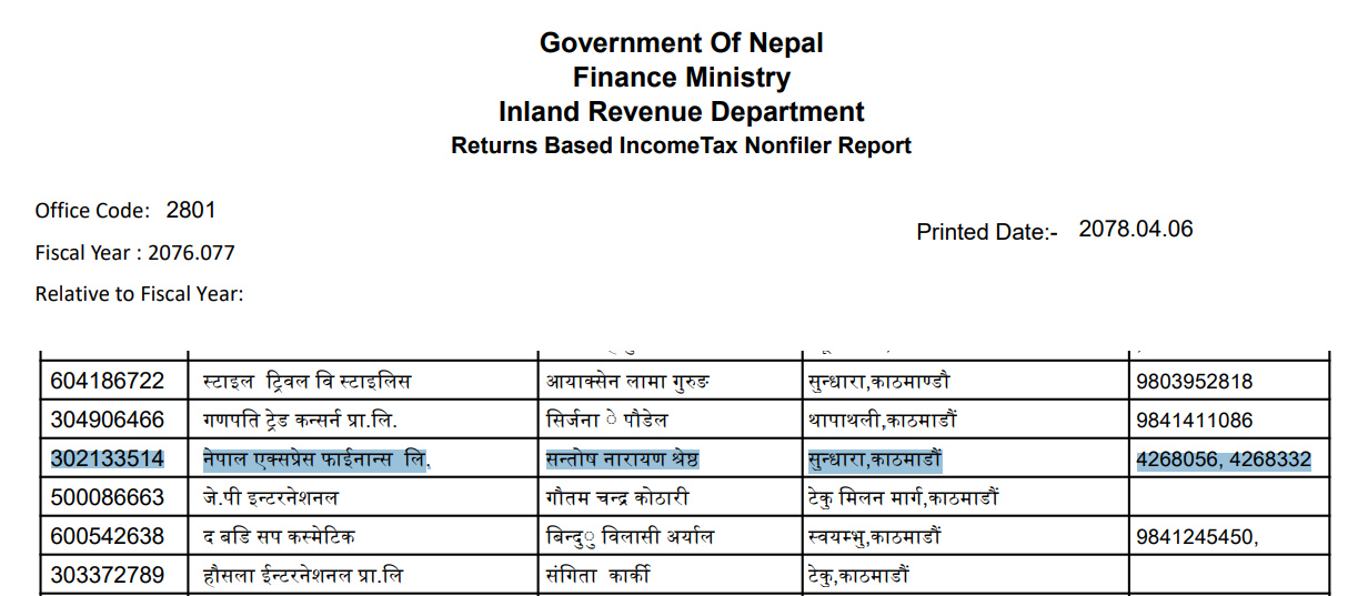 काठमाडौँ । नेपाल धितोपत्र बोर्ड (सेबोन) का अध्यक्ष सन्तोषनारायण श्रेष्ठले स्थापना गरेको नेपाल एक्सप्रेस फाइनान्स करोडौं रुपैयाँ कर नतिरी वेपत्ता भएको छ । नेपाल सरकारको राजस्व उठाउने निकाय कर कार्यालयको तथ्याङ्कमा श्रेष्ठकै नाममा बक्यौता भएपनि हाल भने प्राइम बैंकको नाममा पुगेको तथ्यहरुले देखाएको छ ।