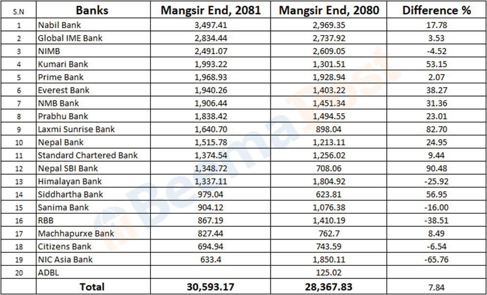 यसअवधिमा कुमारी बैंकको नाफा ५३.१५ प्रतिशतले बढेर १ अर्ब ९९ करोड, प्राइम बैंकको २.०७ प्रतिशतले बढेर १ अर्ब ९६ करोड, एभरेष्ट बैंकको ३८ प्रतिशतले बढेर १ अर्ब ९४ करोड, एनएमबि बैंकको ३१ प्रतिशतले बढेर १ अर्ब ९० करोड रुपैयाँ, प्रभु बैंकको २३ प्रतिशतले बढेर १ अर्ब ८३ करोड, नेपाल बैंकको २४.९५ प्रतिशतले बढेर १ अर्ब ५१ करोड, स्टान्डर्ड चार्टड बैंकको ९.४४ प्रतिशतले बढेर १ अर्ब ३७ करोड रुपैयाँ, सिद्धार्थ बैंकको ५६.९५ प्रतिशतले बढेर ९७ करोड ९० लाख र माछापुच्छे बैंकको ८.४९ प्रतिशतले बढेर ८२ करोड रुपैयाँ पुगेको छ ।