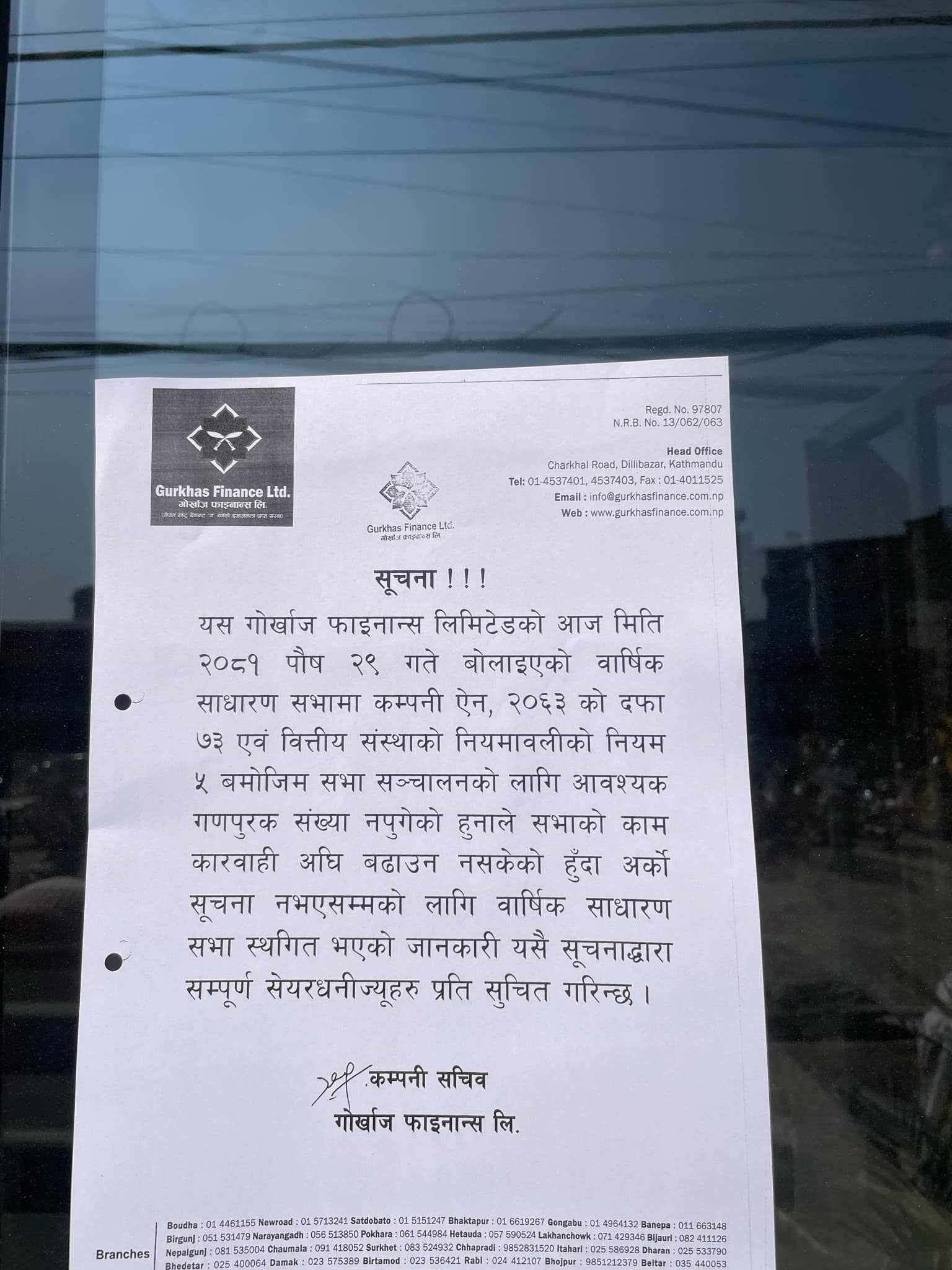 काठमाडौँ । गोर्खाज फाइनान्स लिमिटेडले आज अर्थात् पुष २९ गते बोलाएको वार्षिक साधारण सभा बाँडिएको छ । आवश्यक गणपुरक संख्या नपुगेका कारण स्थगित गरिएको जनाएको हो ।