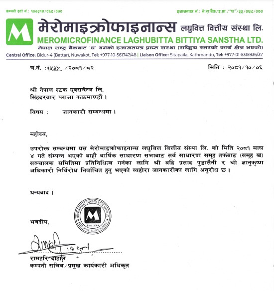 मेरो माइक्रोफाइनान्सको साधारण सभाबाट दुई सञ्चालक निर्विरोध निर्वाचित