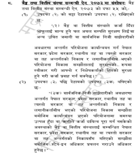 ‘बैङ्क वा वित्तीय संस्थाले कर्जा दिँदा आफूलाई मान्य हुने चल अचल सम्पत्ति सुरक्षण लिई वा अन्य उचित जमानी वा सार्वजनिक निजी साझेदारीको अवधारणा अन्तर्गत परियोजना कार्यान्वयन गर्न नेपाल सरकार प्रदेश सरकार स्थानीय तह वा त्यस्तो सरकार वा तह अन्तर्गतको निकाय र लगानीकर्ताबीच भएको परियोजना विकास सम्झौतालाई सुरक्षणको रूपमा स्वीकार गरी आफ्नो र निक्षेपकर्ताको हितको सुरक्षा हुने गरी कर्जा प्रवाह गर्न सक्नेछ’ संशोधनमा भनिएको छ ।