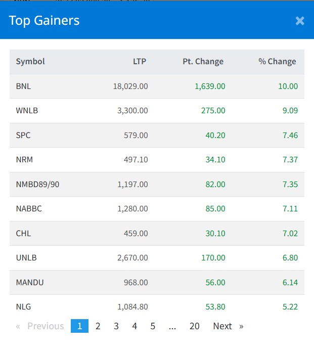 नेपाल रिपब्लिक मिडिया, सामलिङ पावर, छ्याङ्दी हाइड्रोपावर, युनिक नेपाल लघुवित्त, माण्डु हाइड्रोपावर, एनएलजी इन्स्योरेन्स लगायतका शेयरमूल्य बृद्धि भएको छ ।