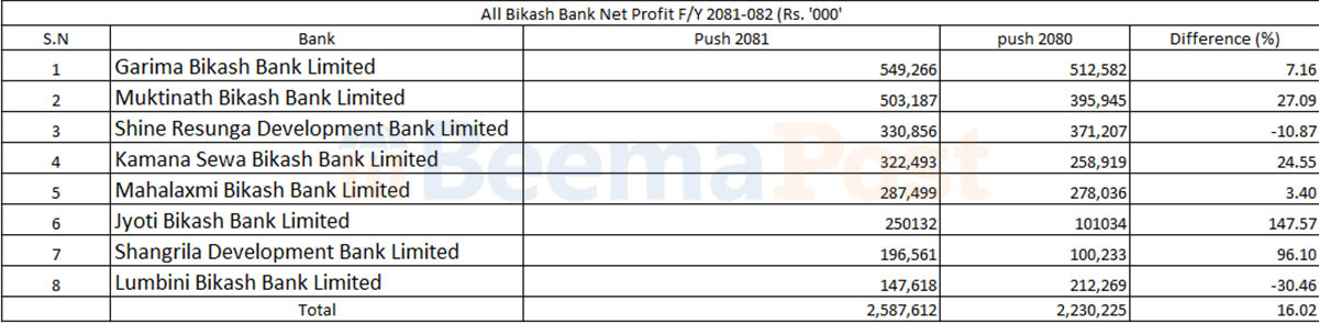 विकास बैंकको नाफा १६ प्रतिशतले बढ्योः नम्बर वान् गरिमा, ग्रोथमा सांग्रिला र ज्योति (सूचीसहित)