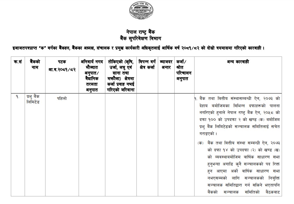 राष्ट्र बैंकका अनुसार प्रभु बैंकलाई वार्षिक साधारण सभाको अनुमोदन प्रक्रिया उल्लंघन गर्दै सञ्चालक नियुक्ति गरेकोमा सचेत गराइएको छ। निरीक्षणका क्रममा निर्देशनको पालनामा कमजोरी देखिएपछि बैंकलाई आगामी दिनमा सुधार गर्न निर्देशनसमेत दिइएको छ।