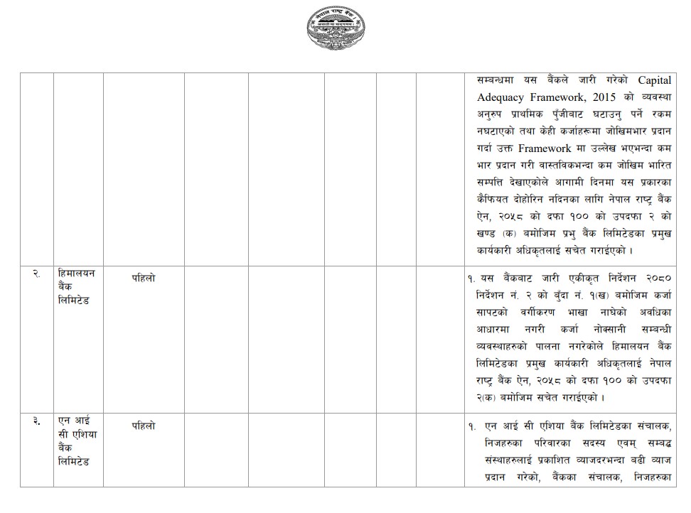 हिमालयन बैंकले कर्जा सापटको वर्गीकरण र नोक्सानी व्यवस्थामा लापरवाही गरेको पाइएकाले प्रमुख कार्यकारी अधिकृतलाई सचेत गराइएको हो। बैंकले जोखिम भारित सम्पत्ति गणनामा त्रुटि गर्दा नियामकीय परिपालना प्रभावित भएको पाइएको छ।