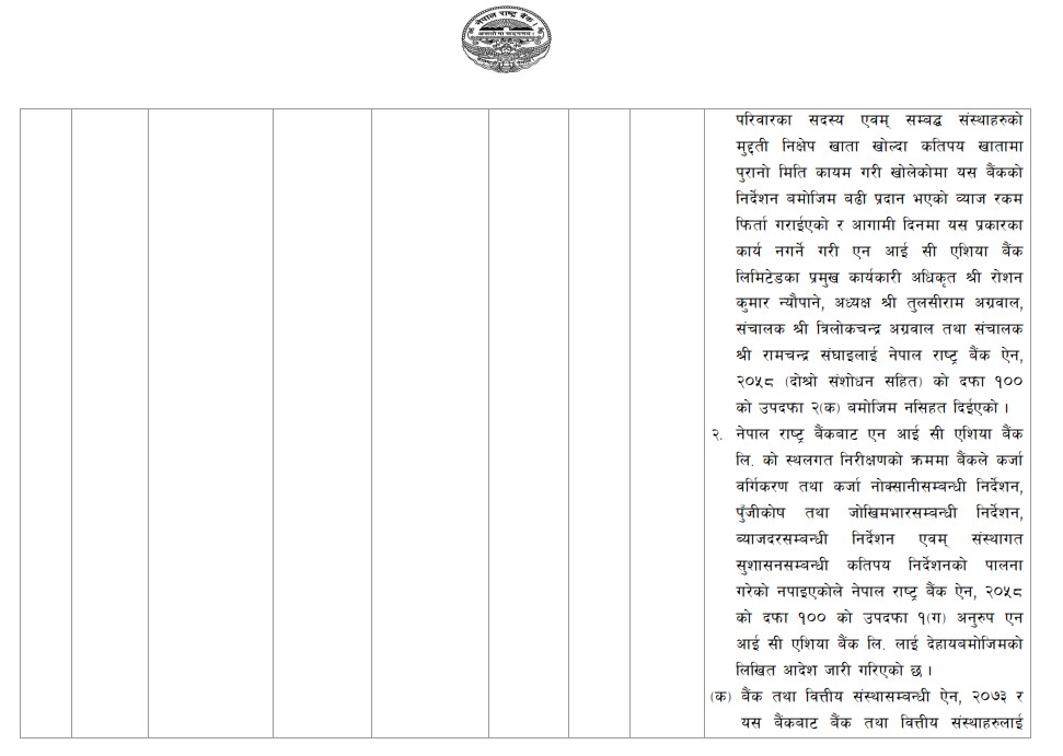 एनआईसी एशिया बैंकले सञ्चालक र सम्बन्धित व्यक्तिहरूलाई उच्च ब्याजदर प्रदान गरेको तथा कतिपय खाता पुरानो मितिमा कायम गरी खुलाएको पाइएको छ। राष्ट्र बैंकले सम्बन्धित व्यक्तिहरूलाई थप व्याजदर फिर्ता गर्न लगाएको छ। साथै, बैंकले कर्जा वर्गीकरण, पुँजी पर्याप्तता र संस्थागत सुशासनसम्बन्धी निर्देशनको पालना नगरेको पाइएपछि कारबाही गरेको छ।