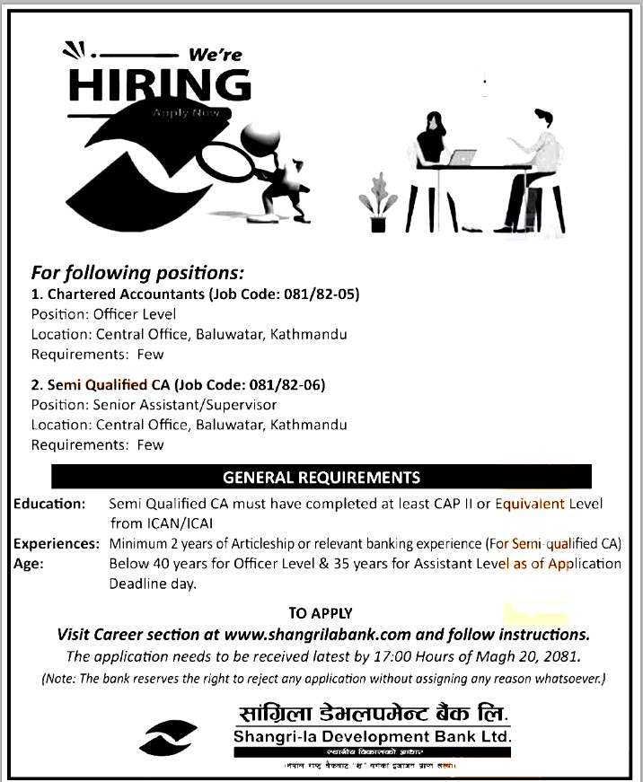 सांग्रिला डेभलपमेन्ट बैंक केन्द्रीय कार्यालयमा रोजगारीको अवसर