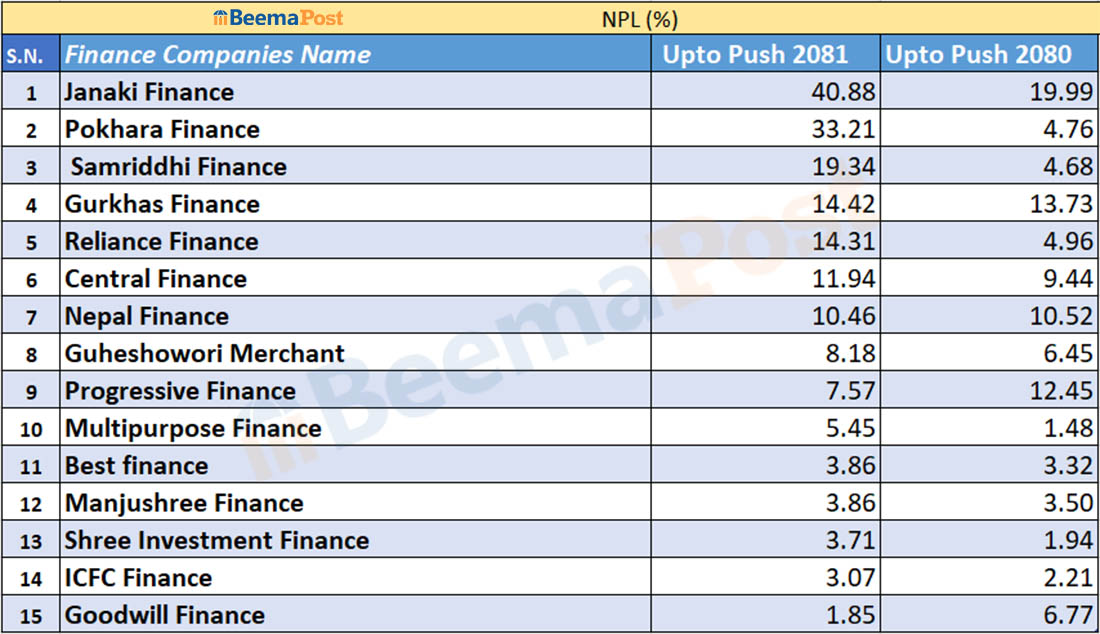 यता, पोखरा फाइनान्सको खराब कर्जा समेत २८.४५ प्रतिशत बढेर ३३.२१ प्रतिशत रहेको छ । समृद्धि फाइनान्सको १९.३४ प्रतिशत, गोर्खाज फाइनान्सको १४.४२ प्रतिशत, रिलायन्स फाइनान्स १४.२१ प्रतिशत, सेन्ट्रल फाइनान्सको ११.९४ प्रतिशत र नेपाल फाइनान्सको १०.४६ प्रतिशत खराब कर्जा रहेको छ ।