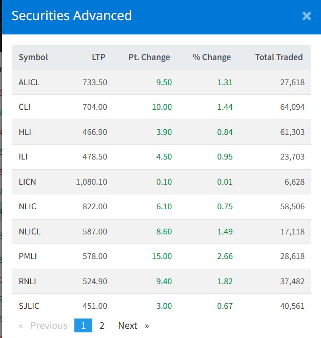 यसदिन जीवन बीमा कम्पनीहरुमध्ये प्रभु महालक्ष्मी लाइफ इन्स्योरेन्सको शेयर २.६६ प्रतिशत अर्थात प्रतिकित्ता १५ रुपैयाँले सर्वाधिक बृद्धि भएको छ । साथै, सन नेपाल लाइफ इन्स्योेरेन्सको १.८९ प्रतिशत र रिलायबल नेपाल लाइफ इन्स्योरेन्सको १.८२ प्रतिशतले शेयरमूल्य बृद्धि भएको छ ।