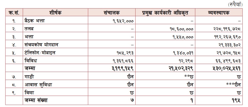 बैंकका व्यवस्थापकहरुले तलब, भत्ता र अन्य सुविधाबापत ५३ करोड २५ हजार रुपैयाँ बुझेको पनि प्रतिवेदनमा उल्लेख छ।