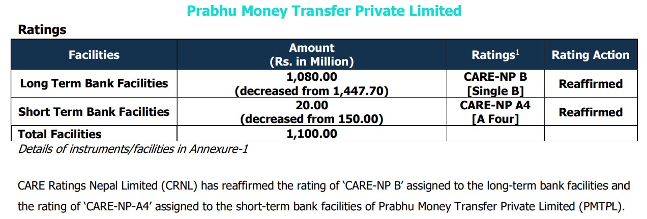 कम्पनी वित्तीय अवस्थामा कमजोर भएपछि १ अर्ब १० करोड लाख रुपैयाँ बराबरको ऋण लिने भएको छ । कम्पनीले दीर्घकालीन र अल्पकालीन गरि सो मात्राको कर्जा सुविधा लिन केयर रेटिङ्ग नेपालमार्फत रेटिङ्ग गराएको छ । रेटिङका आधारमा कम्पनीको वित्तीय स्थिति कमजोर रहेको देखिन्छ । प्रभु मनी ट्रान्सफरको दीर्घकालीन बैंक सुविधाको कूल सीमा १ अर्ब ४४ करोड ७७ लाखबाट घटाएर १ अर्ब ८ करोड मिलियनमा झारिएको छ भने अल्पकालीन बैंक सुविधाको सीमा पनि १५ करोडबाट घटाएर २ करोडमामा झारिएको छ ।