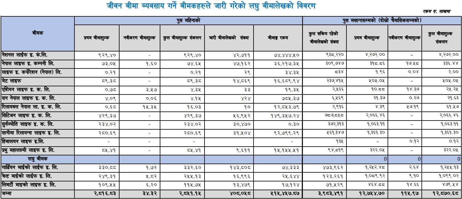 प्राधिकरणले बुधबार मात्रै सार्वजनिक गरेको उक्त तथ्याङ्कअनुसार नेशनल लाइफ एक्लैले लघु बीमालेख मार्फत् ४२ करोड ७२ लाख रुपैयाँ बीमाशुल्क संकलन गरेको छ।