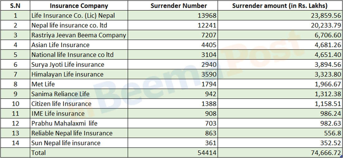 बीमा प्राधिकरणको तथ्यांक अनुसार सरकारी स्वामित्वको राष्ट्रिय जीवन बीमा कम्पनीको ६७ करोड ६ लाख रुपैयाँको बीमा पोलिसी सरेण्डर भएको छ । त्यस्तै, एशियन लाइफ र नेशनल लाइफको ४६ करोड रुपैयाँ, सूर्य ज्योति लाइफको ३८ करोड ९४ लाख रुपैयाँ, हिमालयन लाइफको ३३ करोड ३३ लाख रुपैयाँ र मेट लाइफको १९ करोड ६६ लाख रुपैयाँ बराबरको बीमा पोलिसी सरेण्डर भएका छन् ।