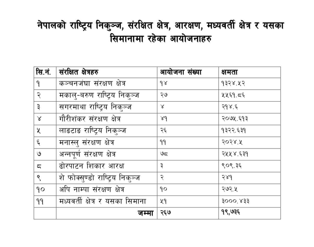 यस्तै, मनास्लु संरक्षण क्षेत्रमा रहेका ११ आयोजनाका दुई हजार २४.५ मेगावाट, अन्नपूर्ण संरक्षण क्षेत्रका ७८ आयोजनाको दुई हजार ५५४.६३१ मेगावाट, ढोरपाटन संरक्षण क्षेत्रमा रहेका तीन आयोजनाको ९०९.३६ मेगावाट, शो फोक्सुण्डो राष्ट्रिय निकुञ्जमा रहेका दुई आयोजनाको २४१ मेगावाट, अपी नाम्पा संरक्षण क्षेत्रमा रहेका १० आयोजनाको २७२.५ मेगावाट तथा मध्यवर्ती क्षेत्र र यसका सिमानामा रहेका ५१ आयोजनाको साढे तीन हजार मेगावाट आयोजना रोक लाग्नेछ ।