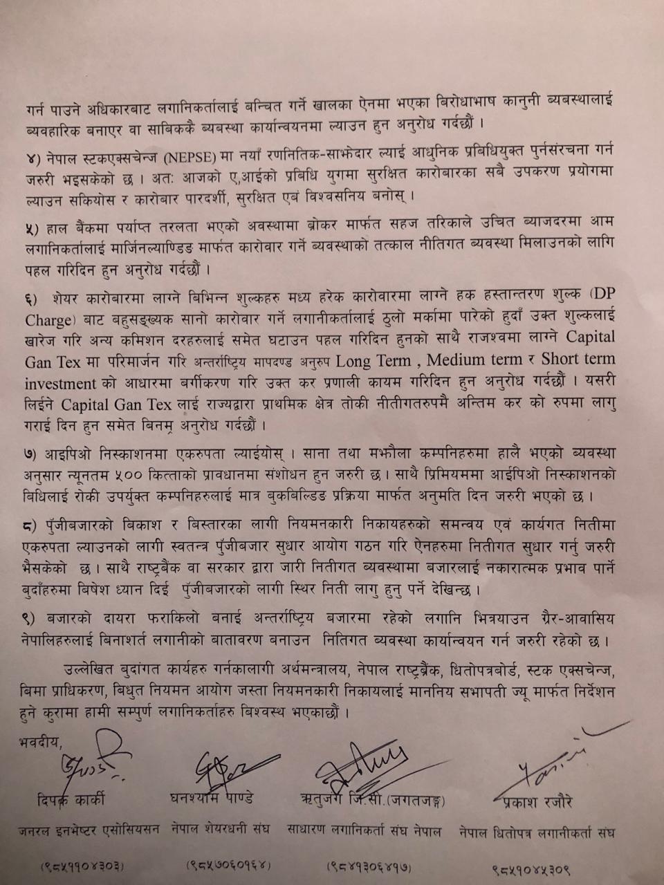 ज्ञापनपत्रमा पुँजीबजारलाई लामो समयदेखि धरासायी बनाउने गलत नीतिहरूलाई सच्याउन र लगानीकर्ताको मनोबल बढाउने गरी ठोस नीति ल्याउन माग गरिएको छ। साथै, पुँजीबजार सुधारका लागि नौ बुँदे सुझाव प्रस्तुत गरिएको छ।