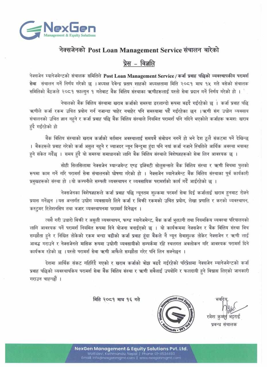 नेक्सजेन म्यानेजमेन्ट एण्ड इक्विटी सोलुसन्सले कर्जा प्रवाह पछिको व्यवस्थापकीय परामर्श सेवा संचालनको घोषणा गरेको छ। यो कम्पनी बैंक वित्तीय संस्थासँग सम्झौता गरेर ऋणीलाई न्यूनतम शुल्कमा परामर्श दिनेछ। यस अन्तर्गत उद्योग व्यवसायलाई कर्जा र बिक्री रकमको उचित प्रयोग, लेखा प्रणाली र कर व्यवस्थापन, कस्टमर रिलेशनशिप, बजार व्यवस्थापन, उधारो बिक्री र असुली व्यवस्थापन, फण्ड म्यानेजमेन्ट र नियमकिय व्यवस्था परिपालनको लागि परामर्श दिइनेछ।