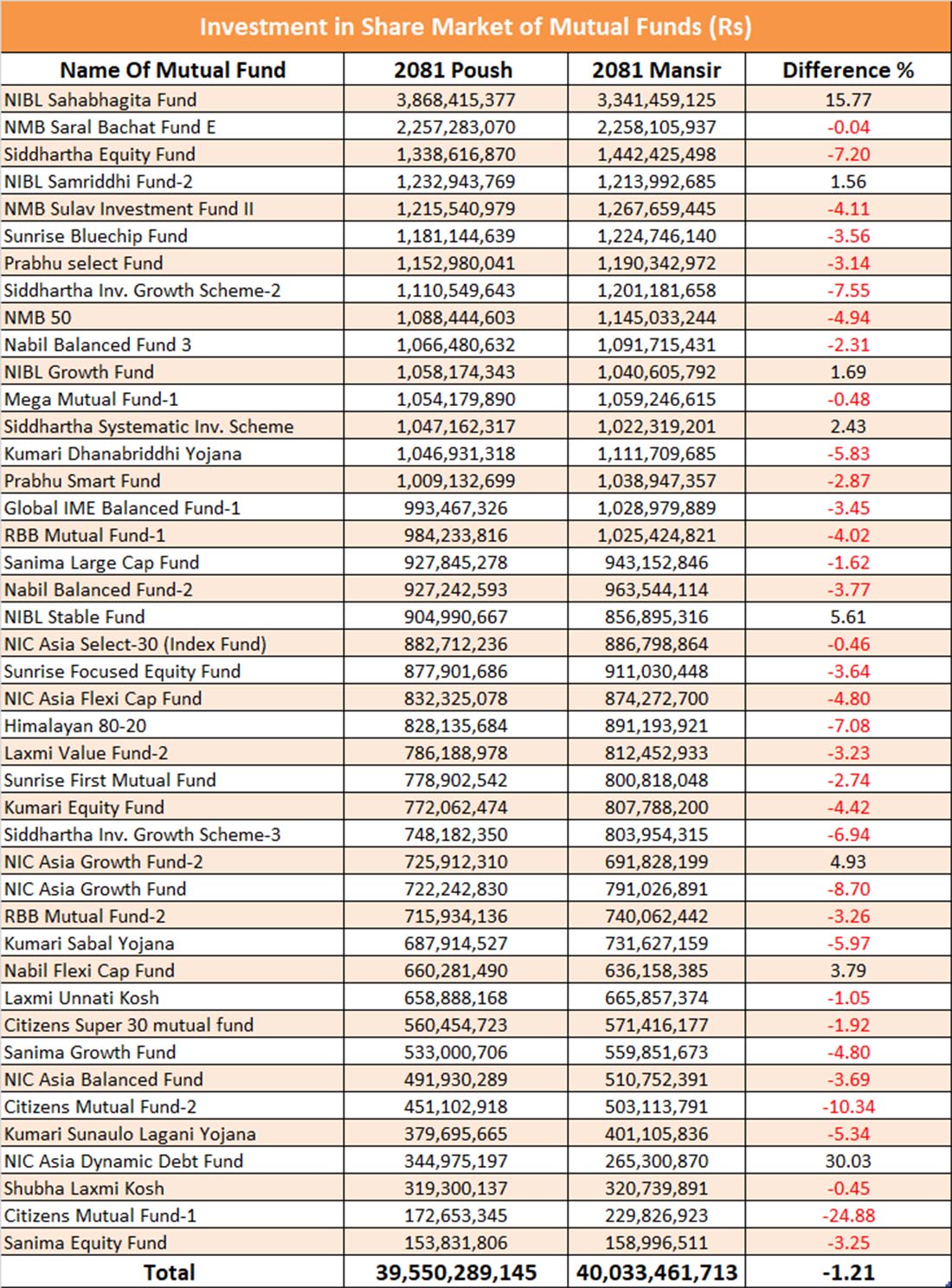 पुस महिनामा एनआइसी एशिया डायनामिक डेप्ट फण्डले लगानी ३०.०३ प्रतिशतले बढाएर ३४ करोड ४९ लाख, एनआईबिएल सहभागिता फण्डले १५.७७ प्रतिशतले बढाएर ३ अर्ब ८६ करोड ८४ लाख, एनआइबिएल स्टेबल फण्डले ५.६१ प्रतिशतले बढाएर ९० करोड ४९ लाख, एनआइसी एशिया ग्रोथ फण्ड २ को ४.९३ प्रतशितले बढेर ७२ करोड ५९ लाख रुपैयाँ रहेको छ ।