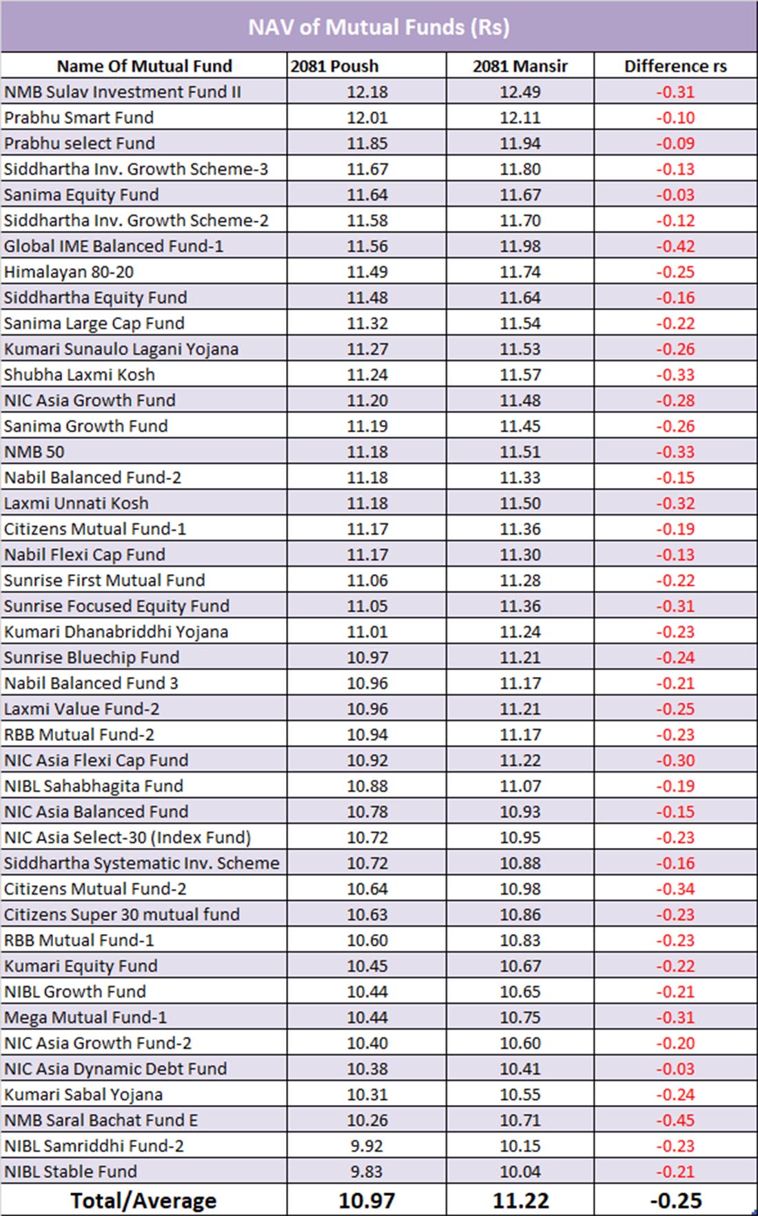 पुस महिनामा म्युचुअल फण्डहरूको औसत खुद सम्पत्ति मूल्य (न्याभ) ०.२५ प्रतिशतले घटेको छ । पुस मसान्तसम्म औसत न्याभ १० रुपैयाँ ९७ पैसा रहेको छ, जुन मंसिरको ११ रुपैयाँ २२ पैसाको तुलनामा कम हो । बजारमा निरन्तर देखिएको सुस्तताका कारण सबै फण्डहरूको न्याभ घटेको देखिन्छ ।