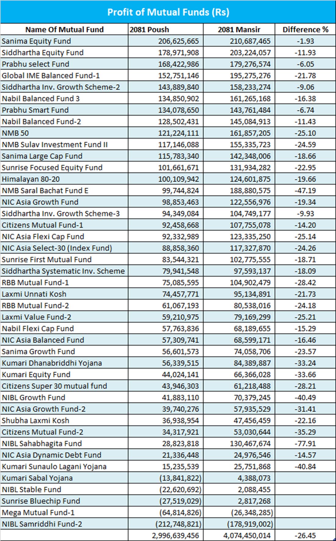 पुषसम्ममा ५ कम्पनीको नाफा ऋणात्मक रहेको छ । कुमारी सबल योजना १ करोड ३८ लाख, एनआइबिएल स्टेबल फण्ड २ करोड २६ लाख, सनराइज ब्लुचिप फण्ड २ करोड ७५ लाख, मेगा म्युचुअल फण्ड १ ६ करोड ४८ लाख र एनआईबिल समृद्धि फण्ड २१ करोड २७ लाख रुपैयाँ ऋणात्मक अवस्थामा रहेका छन् ।