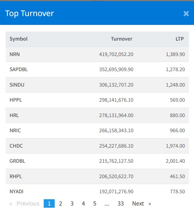 शेयर बजारमा उछाल आएसँगै एनआरएन इन्फ्रास्टक्चरको ४१ करोड ६९ लाख रुपैयाँसहित सबैभन्दा बढी कारोबार भएको छ । साथै, यसदिन सप्तकोशी डेभलपमेन्ट बैंकको ३४ करोड ३४ लाख रुपैयाँको कारोबार भएको छ ।