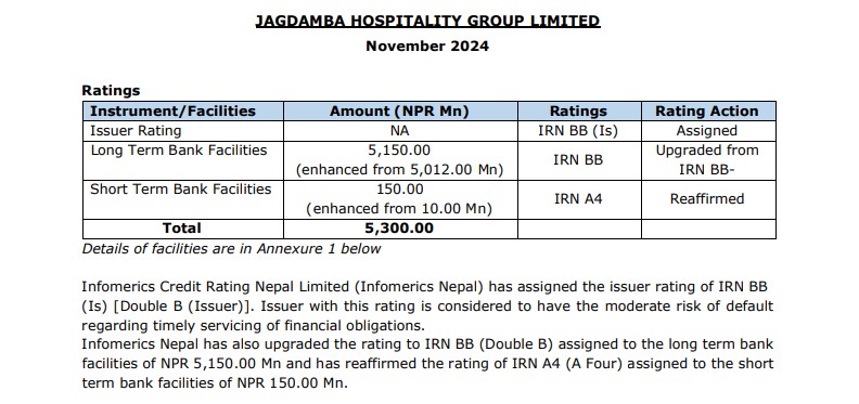 ग्रुपको इश्यूअर रेटिङ्ग डबल बी (इश्यूअर) तोकेको छ । यस रेटिङ्गका अनुसार, यस इश्यूअरलाई वित्तीय दायित्व समयमै भुक्तानी गर्ने क्रममा मध्यम जोखिमको रूपमा मानिएको छ । इन्फोमेरिक्स नेपालले कम्पनीका दीर्घकालीन बैंक सुविधाको रेटिङ्ग डबल बी मा उन्नत गरेको छ, जुन ५ अर्ब १५ करोड मिलियन रुपैयाँ (पहिल्यै तोकिएको ५ अर्ब १ करोड २० लाख रुपैयाँबाट वृद्धि) छ । यसका साथै, इन्फोमेरिक्स नेपालले कम्पनीको छोटो अवधिका बैंक सुविधाको रेटिङ्ग ए चार लाई पुनः पुष्टि गरेको छ, जुन १५ करोड रुपैयाँ छ ।