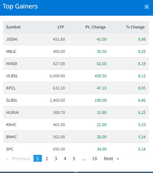 यता, सामुदायिक लघुवित्तको ८.३० प्रतिशत, मध्यभोटेकोशी जलविद्युतको ८.२५ प्रतिशत, न्यादी हाइड्रोपावरको ८.१९ प्रतिशत र उपकार लघुवित्तको ८.१२ प्रतिशतले शेयर मूल्य बढेको छ ।