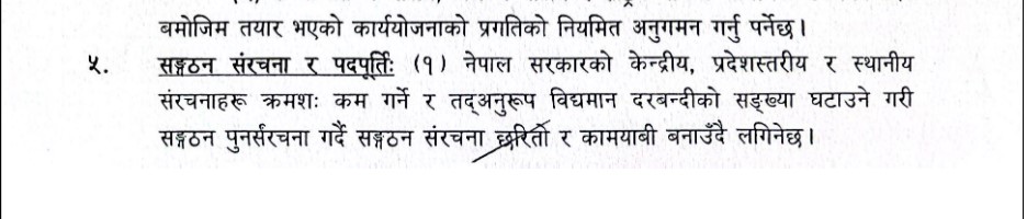 ‘नेपाल सरकारको केन्द्रीय, प्रदेशस्तरीय र स्थानीय संरचनाहरू क्रमशः कम गर्ने र तअनुरूप विद्यमान दरबन्दीको सङ्ख्या घटाउने गरी सङ्गठन पुनर्संरचना गर्दै सङ्गठन संरचना छरितो र कामयाबी बनाउँदै लगिनेछ’ मापदण्डमा भनिएको छ ।