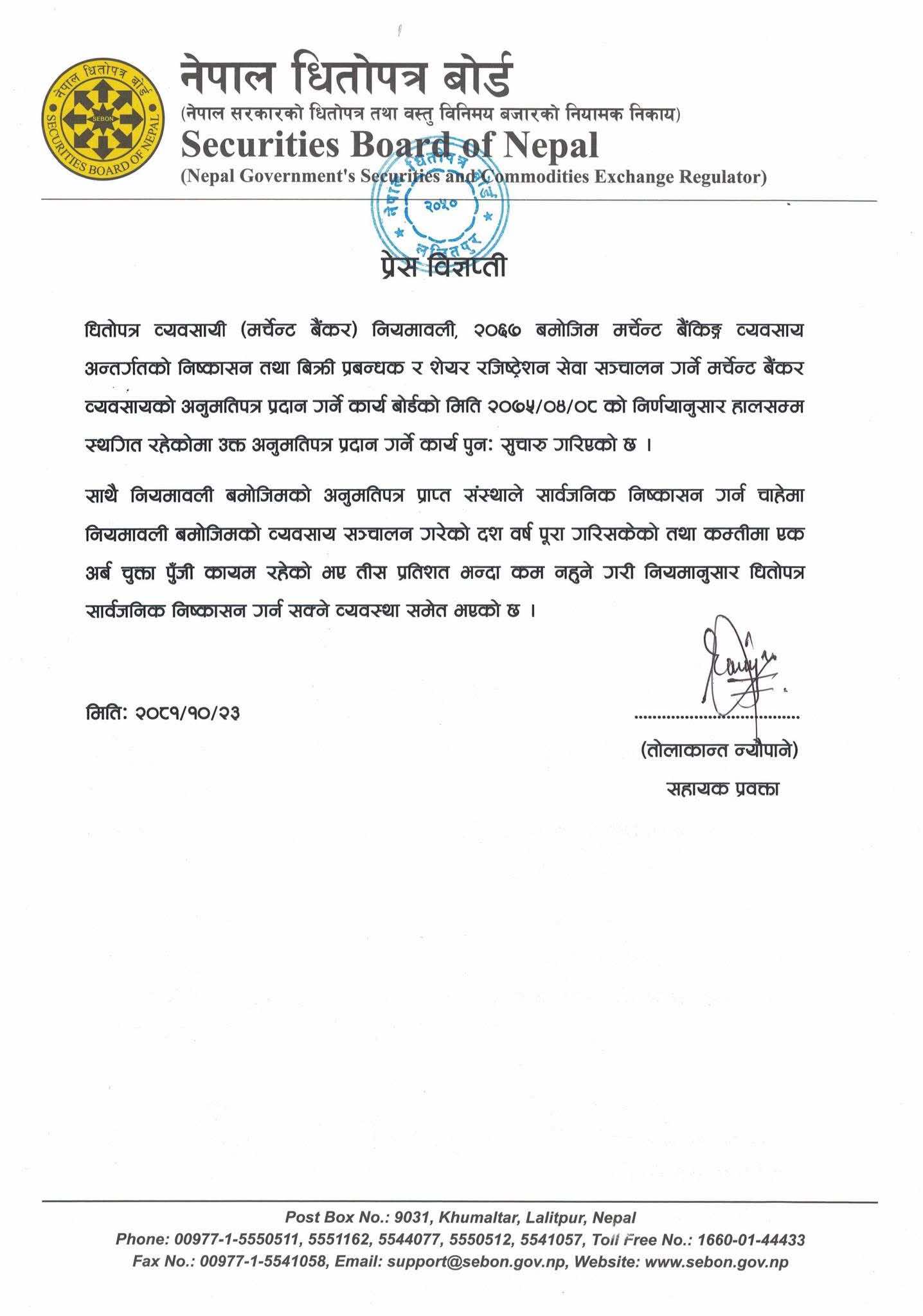 नेपाल धितोपत्र बोर्डले जारी गरेको विज्ञप्तिमा भनेको छ, धितोपत्र व्यवसायी मर्चेन्ट बैंकर नियमावली २०६७ बमोजिम मर्चेन्ट बैकिङ्ग व्यवसाय अन्तर्गतको निष्कासन तथा बिक्री प्रबन्धक र शेयर रजिष्ट्रेशन सेवा सञ्चालन गर्ने मर्चेन्ट बैंकर व्यवसायको अनुमतिपत्र प्रदान गर्ने कार्य हाल पुनः प्रारम्भ गरिएको छ।