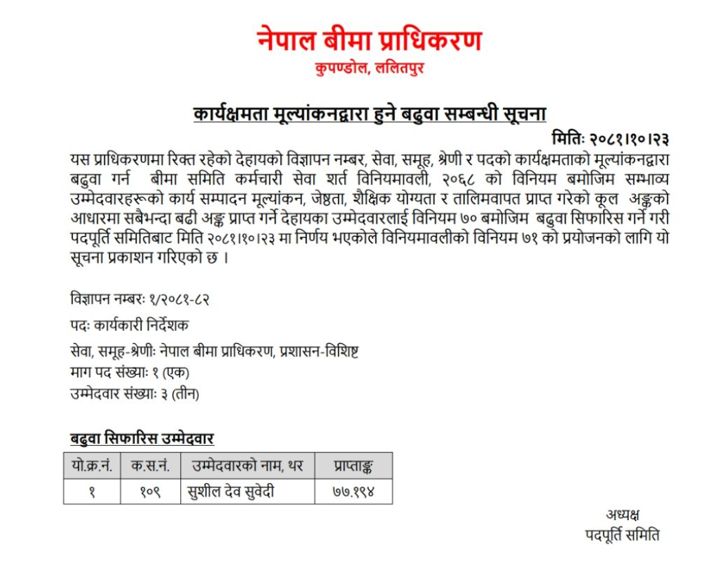 प्राधिकरणमा लोकसेवा आयोगको टिम, बीमा प्राधिकरणकै पदपूर्ति समितिका अध्यक्ष मदन दाहाल र बिज्ञ सदस्यसहितको टोलीले कार्य सम्पादन मूल्याङ्कनसहितको विधि अनुसार सुशिलदेव सुवेदीलाई नियुक्त गर्ने सिफारिस गरेको हो । पदपूर्ति समितिको सिफारिस अनुसार सुवेदीले सूचना प्रकाशित भई कार्यालय खुलेपछि नियुक्ती पत्र पाउनेछन् । साथै पदभार ग्रहण गर्नेछन् ।