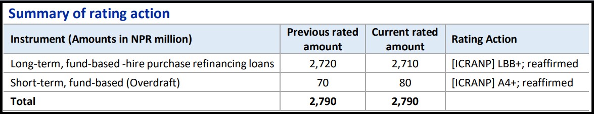 कम्पनीले दीर्घकालिन ऋणका लागि एल डबल बी प्लसको रेटिङ पाएको छ भने अल्पकालिन ऋणका लागि ए फोर प्लसको रेटिङ प्राप्त गरेको छ । कम्पनीले दीर्घकालीन ऋण अन्तर्गत हायर पर्चेज पुनः वित्तीयकरण कर्जा योजना अन्तर्गत २ अर्ब ७१ करोड रुपैयाँ र अल्पकालीन ओभरड्राफ्ट अन्तर्गत ८ करोड रुपैयाँको ऋण व्यवस्थापन गरेको छ ।