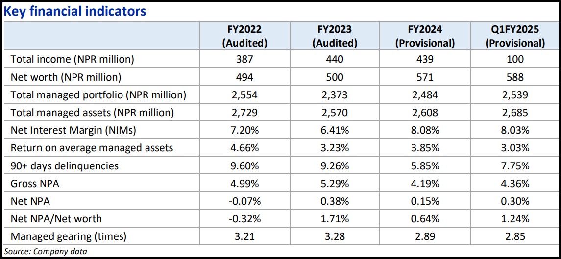कम्पनीको कुल व्यवस्थापन गरिएको पोर्टफोलियो पनि सन्तोषजनक देखिएको छैन । कम्पनीले पोर्टफोलियो भन्दा बढी ऋण लिन लागेको देखिएको छ । सन् २०२२ मा २ अर्ब ५५ करोड ४० लाख रुपैयाँ रहेको पोर्टफोलियो सन् २०२३ मा घटेर २ अर्ब ३७ करोड ३० लाख रुपैयाँमा झरेको थियो । यद्यपि सन् २०२४ मा २ अर्ब ४८ करोड ४० लाख पुगे पनि यो स्थिर सुधारको संकेत दिन सकेको छैन ।