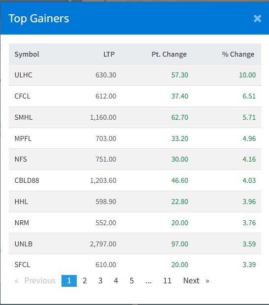 बिहीबार सेन्ट्रल फाइनान्सको शेयरमूल्य ६.५१ प्रतिशत, सुपरमादी हाइड्रोपावरको ५.७१ प्रतिशत, मल्टिप्रपोज फाइनान्सको ४.९६ प्रतिशत र नेपाल फाइनान्सको ४.१६ प्रतिशतले शेयरमूल्य बृद्धि भएको छ ।