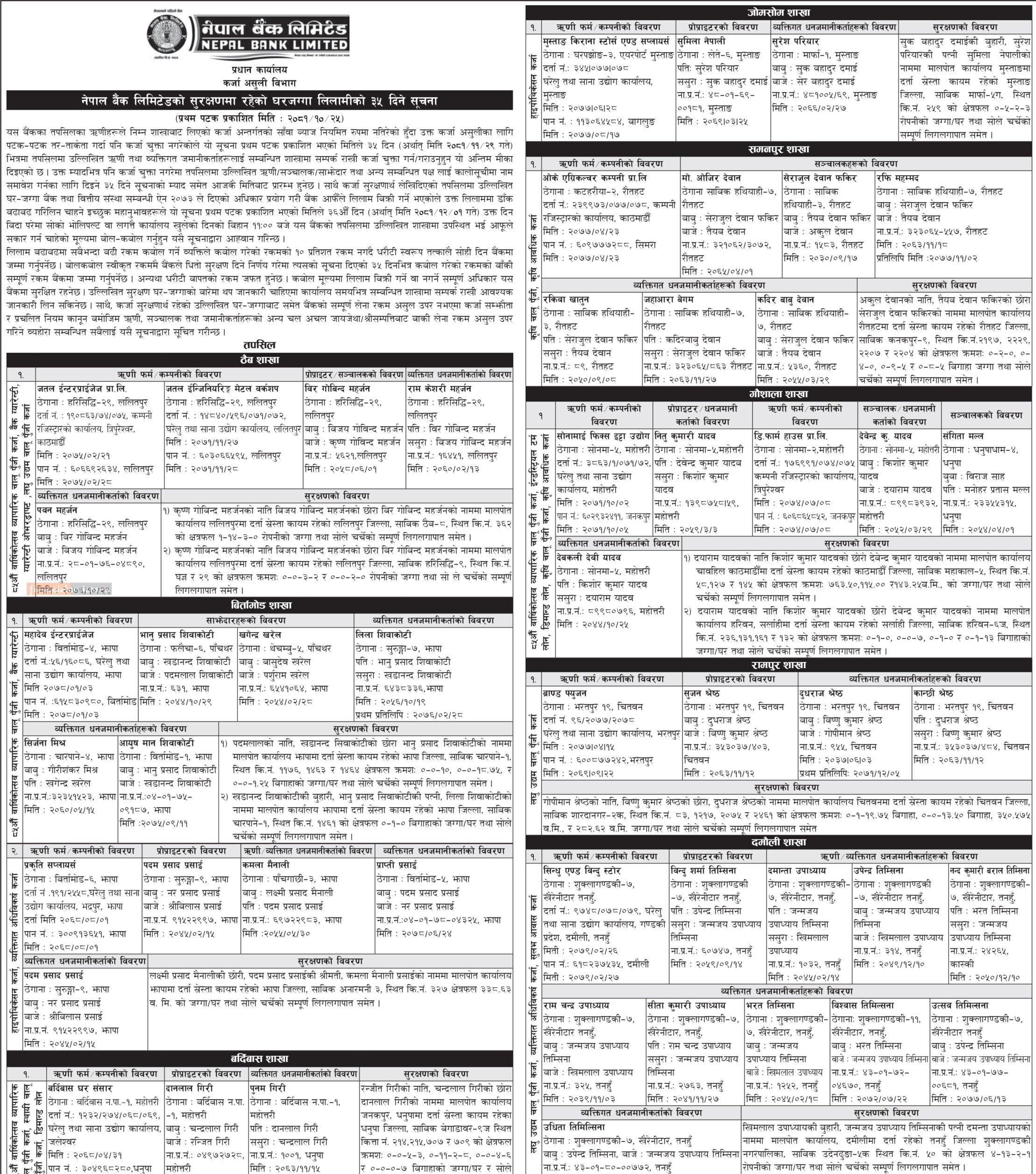 काठमाडौं । नेपाल बैंकले विभिन्न शाखाबाट कर्जा लिएर चुक्ता नगर्ने ऋणीहरुको जग्गा लिलामका लागि ३५ दिने समय दिएको छ । बैंकले विभिन्न व्यक्तिको नाममा रहेको सम्पत्ति ३५ दिन भित्र चुक्ता नभए लिलामी गर्ने जानकारी दिएको छ।