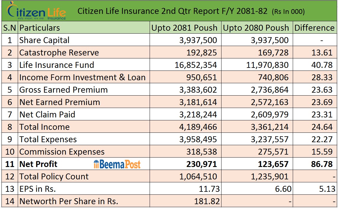 सिटिजन लाइफको नाफा ८६ प्रतिशत वृद्धि, जीवन बीमाकोष १७ अर्ब नजिक