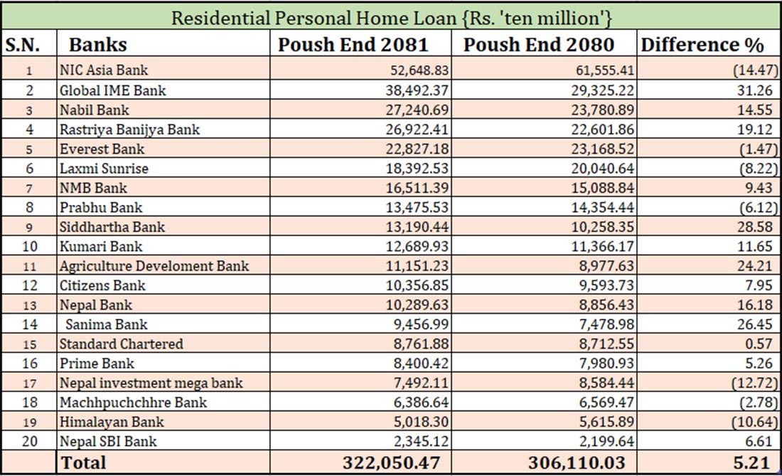 त्यस्तै, ग्लोबल आइएमई बैंकले ३८ अर्ब ४९ करोड, २७ करोड २४ लाख, राष्ट्रिय वाणिज्य बैंकले २६अर्ब ९२ करोड, एभरेष्ट बैकले २२ अर्ब ८२ करोड, लक्ष्मी सनराइज बैंकले १८ अर्ब ३९ करोड, एनएमबि बैंकले १६ अर्ब ५१ करोड, प्रभु बैंकले १३ अर्ब ४७ करोड, सिद्धार्थ बैंकले १३ अर्ब १९ करोड,कुमारी बैकले १२ अर्ब ६८ करोड र कृषि विकास बैैंकले ११ अर्ब १५ करोड रुपैयाँ आवासीय कर्जा प्रभाव गरेका छन् । अन्य ९ बैंकले १० अर्ब तल कर्जा प्रभाव गरेका छन् ।