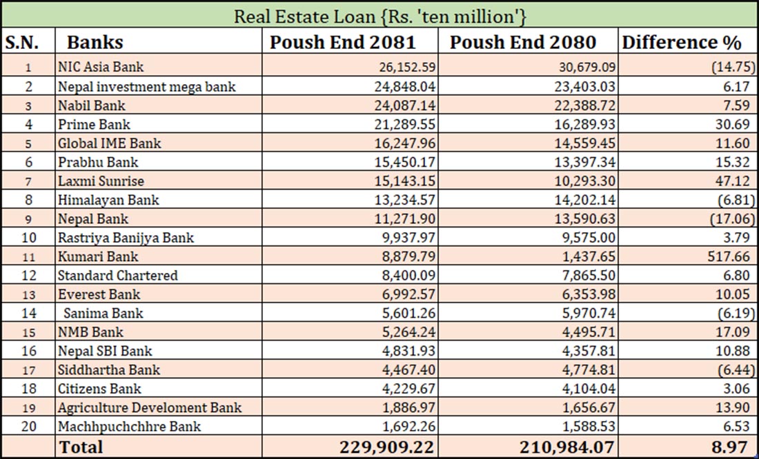 साथै, नेपाल इन्भेष्टमेन्ट मेगा बैंकले २४ अर्ब ८४ करोड, नबिल बैकले २४ अर्ब ८ करोड, प्राइम बैंकले २१ अर्ब २८ करोड, ग्लोबल आइएमई बैंकले १६ अर्ब २४ करोड, प्रभु बैंकले १५ अर्ब ४५ करोड, लक्ष्मी सनराइज बैंकले १५ अर्ब १४ करोड, हिमालयन बैंकले १३ अर्ब २३ करोड र नेपाल बैंकले ११ अर्ब २७ करोड रुपैयाँ रियल इस्टेट कर्जा प्रभाव गरेका छन् ।