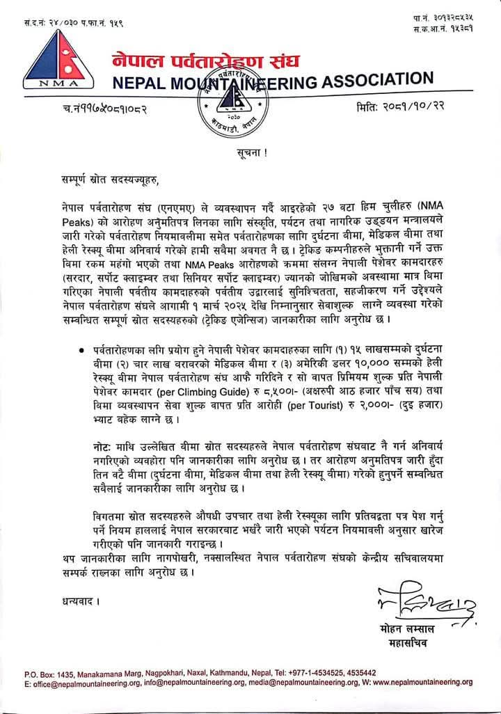 सगरमाथा लुम्बिनी इन्स्योरेन्स कम्पनीसँगको सम्झौतामा यस योजनालाई कार्यान्वयन गरीने संघले जानकारी दिएको छ । सम्झौतामा एनएमएका अध्यक्ष निम नुरु शेर्पा र सगरमाथा लुम्बिनीका प्रमुख कार्यकारी अधिकृत चंकी क्षेत्रीले हस्ताक्षर गरेका हुन् । संघले ल्याएको उक्त नयाँ योजना २०२५ मार्च १ देखि लागू हुनेछ।