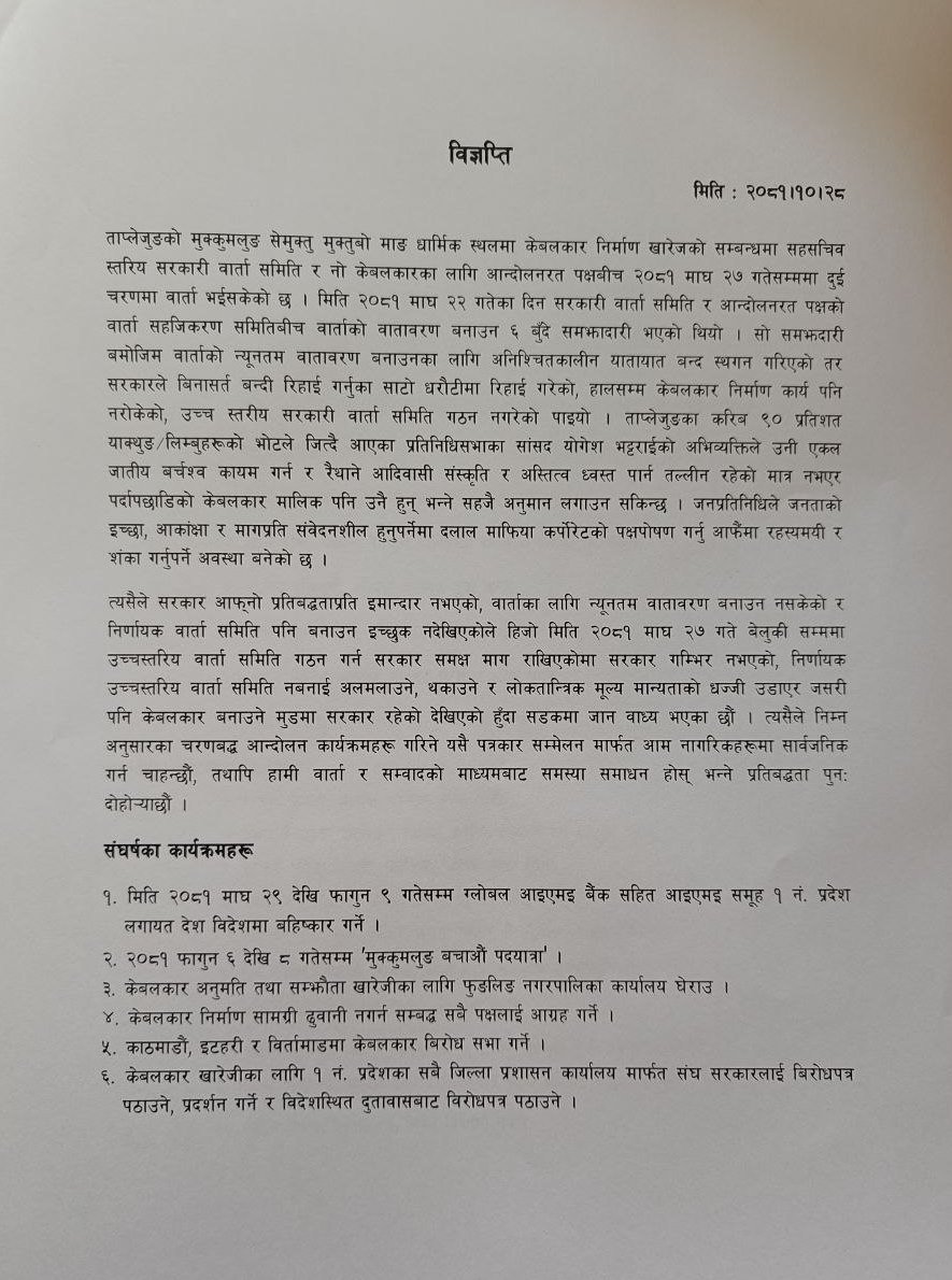 उनीहरूले माघ २९ गतेदेखि फागुन ९ गतेसम्म केबलकार विरोधमा विभिन्न स्थानमा विरोध सभा र प्रदर्शन गर्ने योजना पनि सार्वजनिक गरेका छन्।