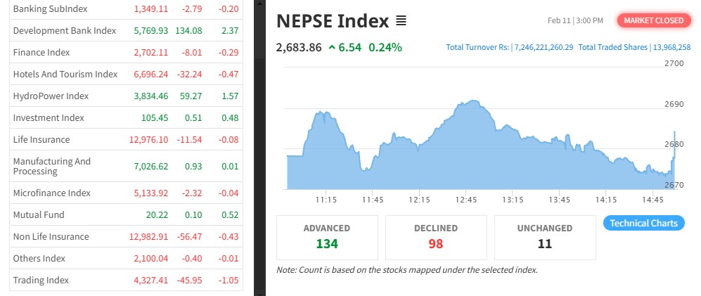 नेपाल स्टक एक्सचेञ्ज (नेप्से) ६.५४ अकंले बढेर २६८३.८६ बिन्दुमा कायम भएको छ । आज २९९ कम्पनीको १ करोड ३९ लाख ६८ हजार कित्ता शेयर किनेबच हुँदा ७ अर्ब २४ करोडको शेयर कारोबार भएको छ ।