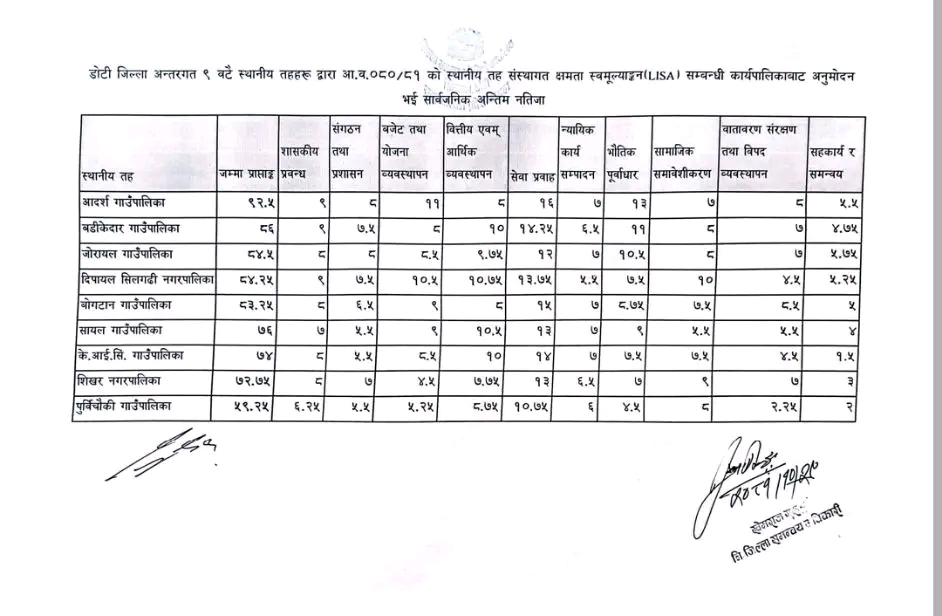 डोटीमा स्थानीय तहको संस्थागत क्षमता स्वमूल्याङ्कनमा पूर्वीचौकी र शिखर कमजोर