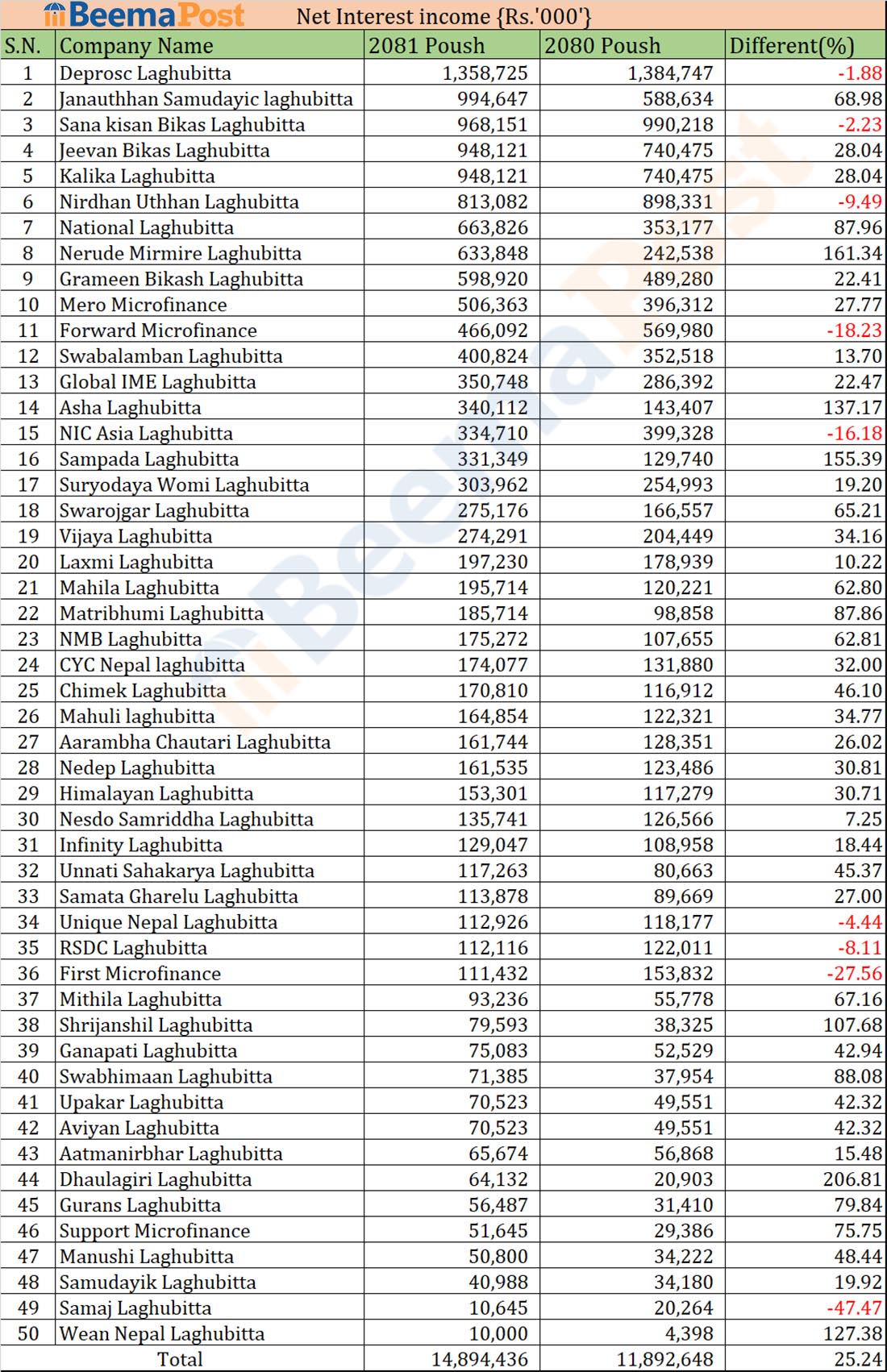 पुष मसान्तसम्मको अवधिमा लघुवित्तहरुको खुद ब्याज आम्दानी क्रमशः साना किसानको ९६ करोड ८१ लाख, जीवन विकास लघुवित्तको ९४ करोड ८१ लाख, कालिका लघुवित्तको ९४ करोड ८१ लाख, निर्धन उत्थान लघुवित्तको ८१ करोड ३० लाख, नेशनल लघुवित्तको ६६ करोड ३८ लाख रुपैयाँ रहेको छ ।