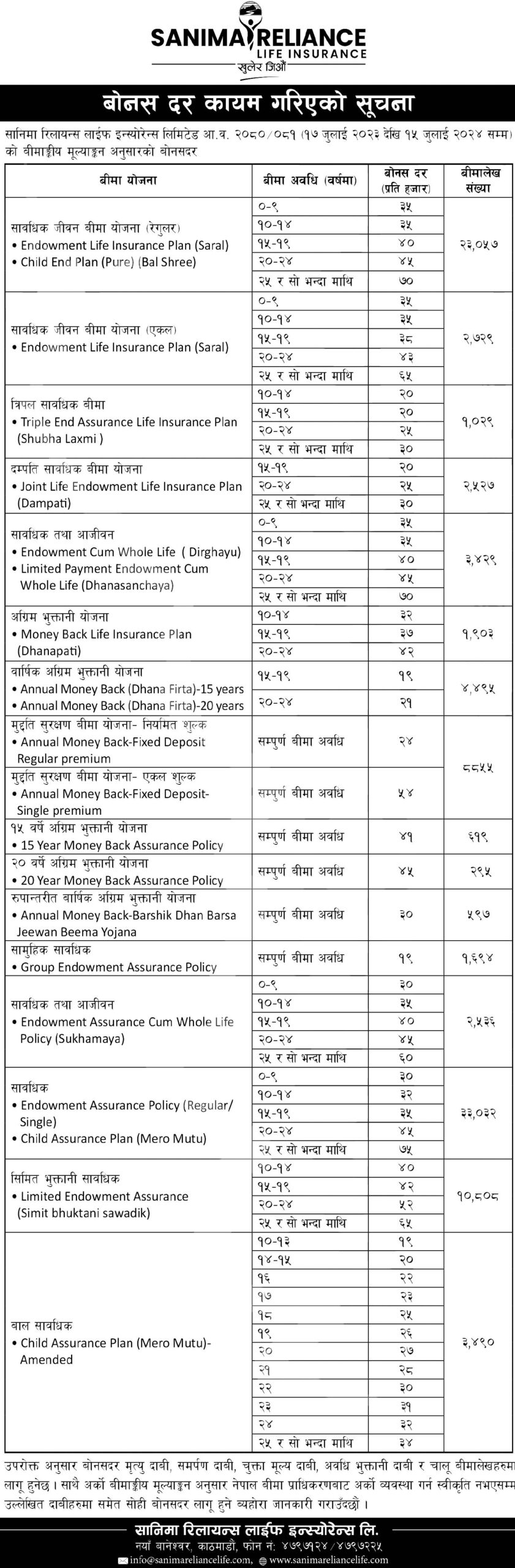 कम्पनीले सावधिक जीवन बीमा योजना (रेगुलर) बीमा योजनामा बीमा अवधिअनुसार न्यूनतम ३५ रुपैयाँदेखि ७० रुपैयाँसम्म बोनसदर निर्धारण गरेको छ भने एकलतर्फ ३५ रुपैयाँदेखि ६५ रुपैयाँसम्म बोनस दिने भएको छ।