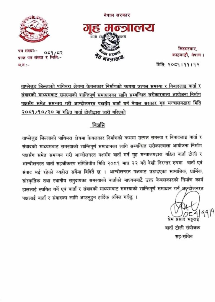 माघ १२ गते पाथीभरा क्षेत्रमा प्रहरी र ‘नो केबलकार समूह’ बीच झडप भएपछि विवाद अझ चर्किएको थियो। एक महिनासम्म समाधान निस्कन नसकेको यस विषयमा अहिले सडकदेखि संसदसम्म बहस चलिरहेको छ। स्थानीय समुदाय, धार्मिक आस्थाका समूह र पर्यावरणविद्हरूले विभिन्न कोणबाट विरोध जारी राखेपछि सरकार वार्तामार्फत समस्या समाधान गर्न सक्रिय देखिएको हो।