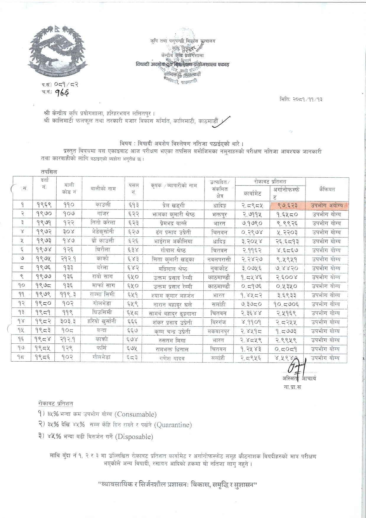 उक्त पसलको काउलीमा ९७ दशमलव ६२३ प्रतिशत अर्गानोफस्फेट नामको विषादी पाइएपछि विषादी प्रयोगशाला एकाईले उपभोग गर्न अयोग्य घोषित गरेको छ।
