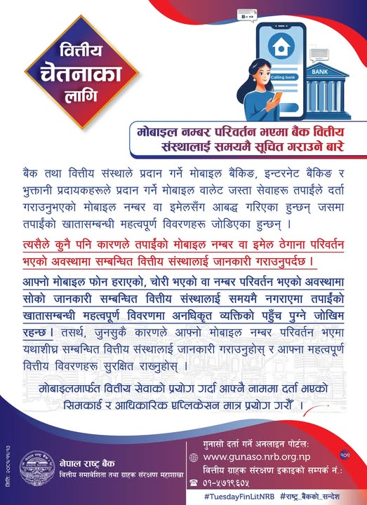 मोबाइल नम्बर परिवर्तन हुँदा बैंकलाई तुरुन्तै जानकारी गराउनुहोस्ः राष्ट्र बैंक