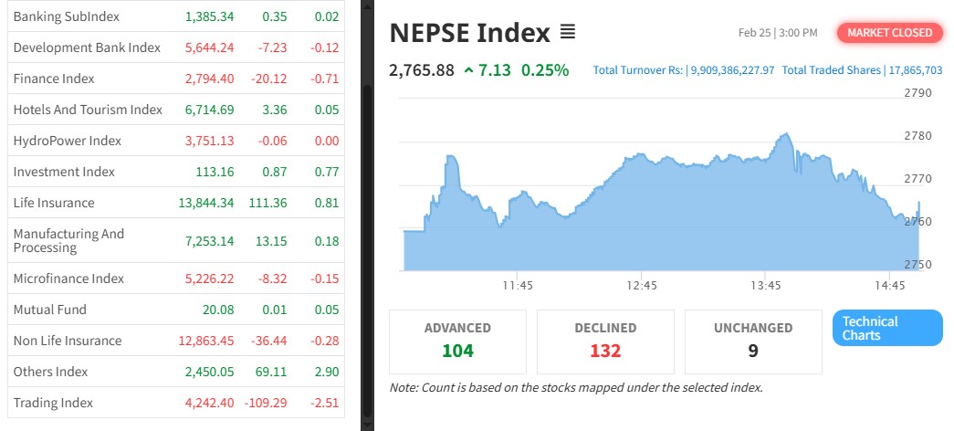 नेपाल स्टक एक्सचेञ्ज (नेप्से) ७.१३ अकंले बढेर २७६५.८८ बिन्दुमा कायम भएको छ । आज ३१२ कम्पनीको १ करोड ७८ लाख ६५ हजार कित्ता शेयर किनबेच हुँदा ९ अर्ब ९० करोड ९३ लाख रुपैयाँको कारोबार भएको छ ।