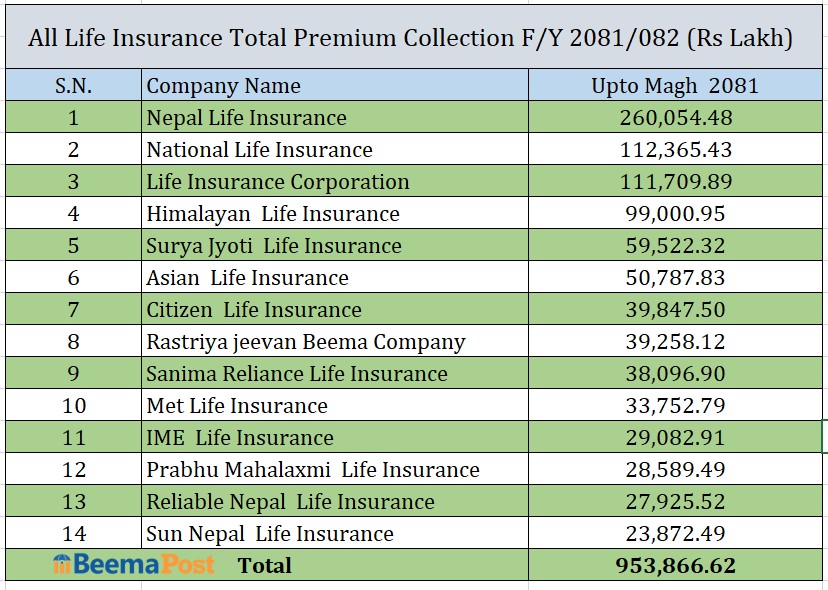 जीवन बीमा कम्पनीको बीमा शुल्क आर्जन ९५ अर्ब ३८ करोड, कुनको कति ?