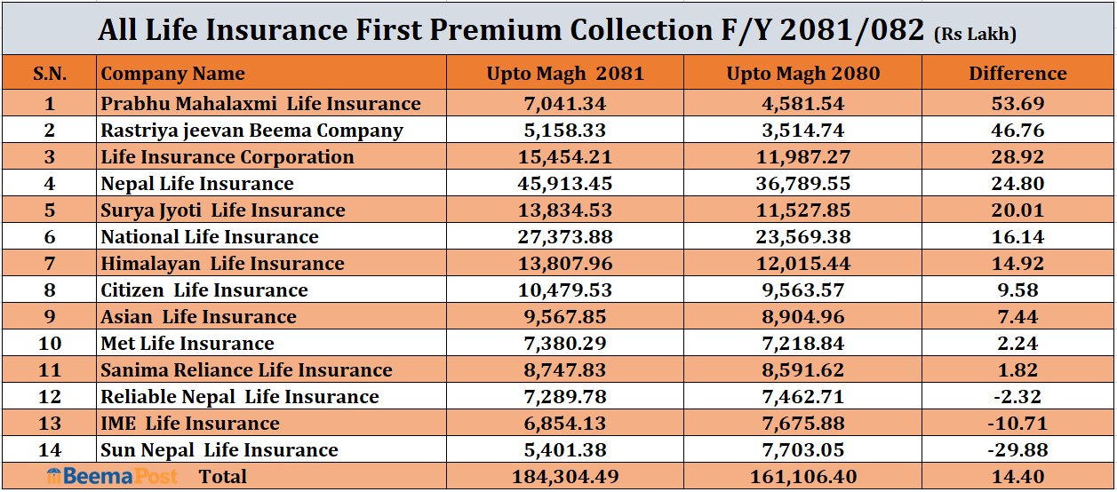 त्यस्तै सिटिजन लाइफले एक अर्ब चार करोड ७९ लाख रुपैयाँ, एशियन लाइफले ९५ करोड ६७ लाख रुपैयाँ, सानिमा रिलायन्स लाइफले ८७ करोड ४७ लाख रुपैयाँ, मेट लाइफले ७३ करोड ८० लाख रुपैयाँ, रिलायबल नेपाल लाइफले ७२ करोड ८९ लाख रुपैयाँ, प्रभु महालक्ष्मीले ७० करोड ४१ लाख रुपैयाँ, आइएमई लाइफले ६८ करोड ५४ लाख रुपैयाँ, सन नेपाल लाइफले ५४ करोड ०१ लाख रुपैयाँ र राष्ट्रिय जीवन बीमा कम्पनीले ५१ करोड ५८ लाख रुपैयाँ प्रथम बीमाशूल्क आर्जन गरेका छन्।