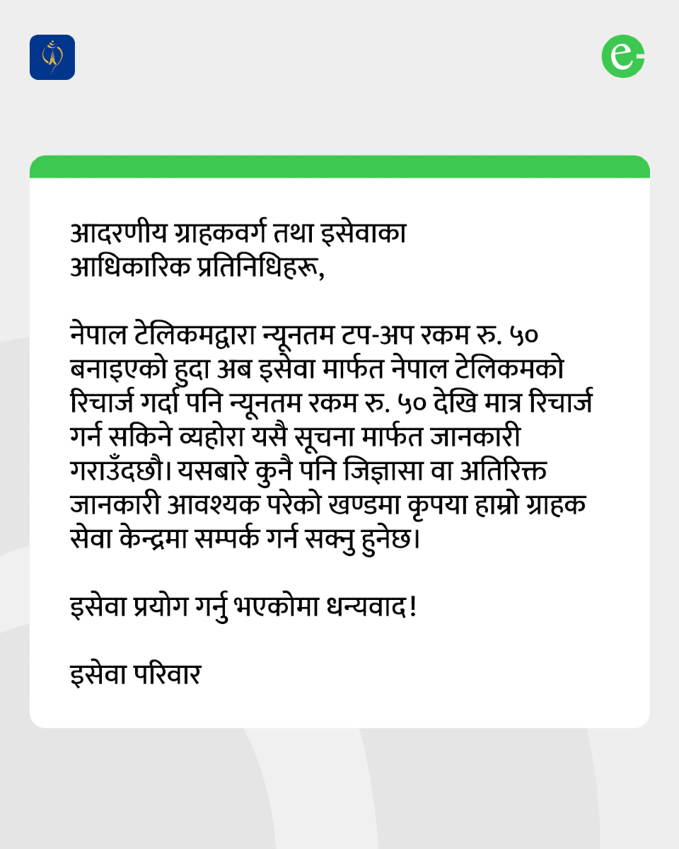इसेवाका अनुसार ग्राहकहरूले अब ५० रुपैयाँ वा सोभन्दा बढी रकम मात्र इसेवाबाट टेलिकमको मोबाइल, ल्याण्डलाइन, एफटीटीएच तथा अन्य सेवाहरूको रिचार्ज गर्न सक्नेछन्। छ।