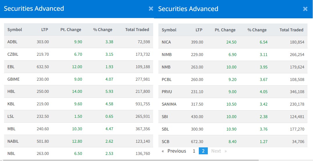 त्यस्तै, हिमालयन बैंकको ५.९३ प्रतिशत, ग्लोबल आइएमई बैंकको ४.०७ प्रतिशत, कुमारी बैंकको ४.५८ प्रतिशत, माछापुच्छ्रे बैंकको ४.४७ प्रतिशत र प्रभु बैंकको ४.०५ प्रतिशतले शेयर मूल्य बढेको छ ।